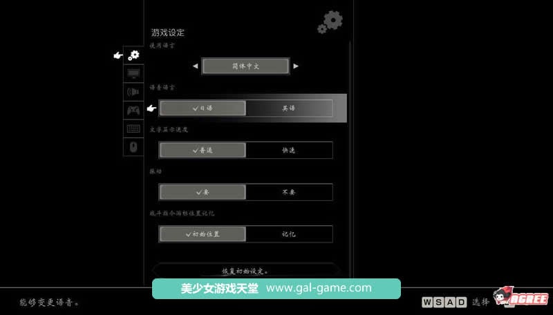 游戏初始界面可设置简体中文/繁体中文,及语音叙述的语言种类日语/英语可选。